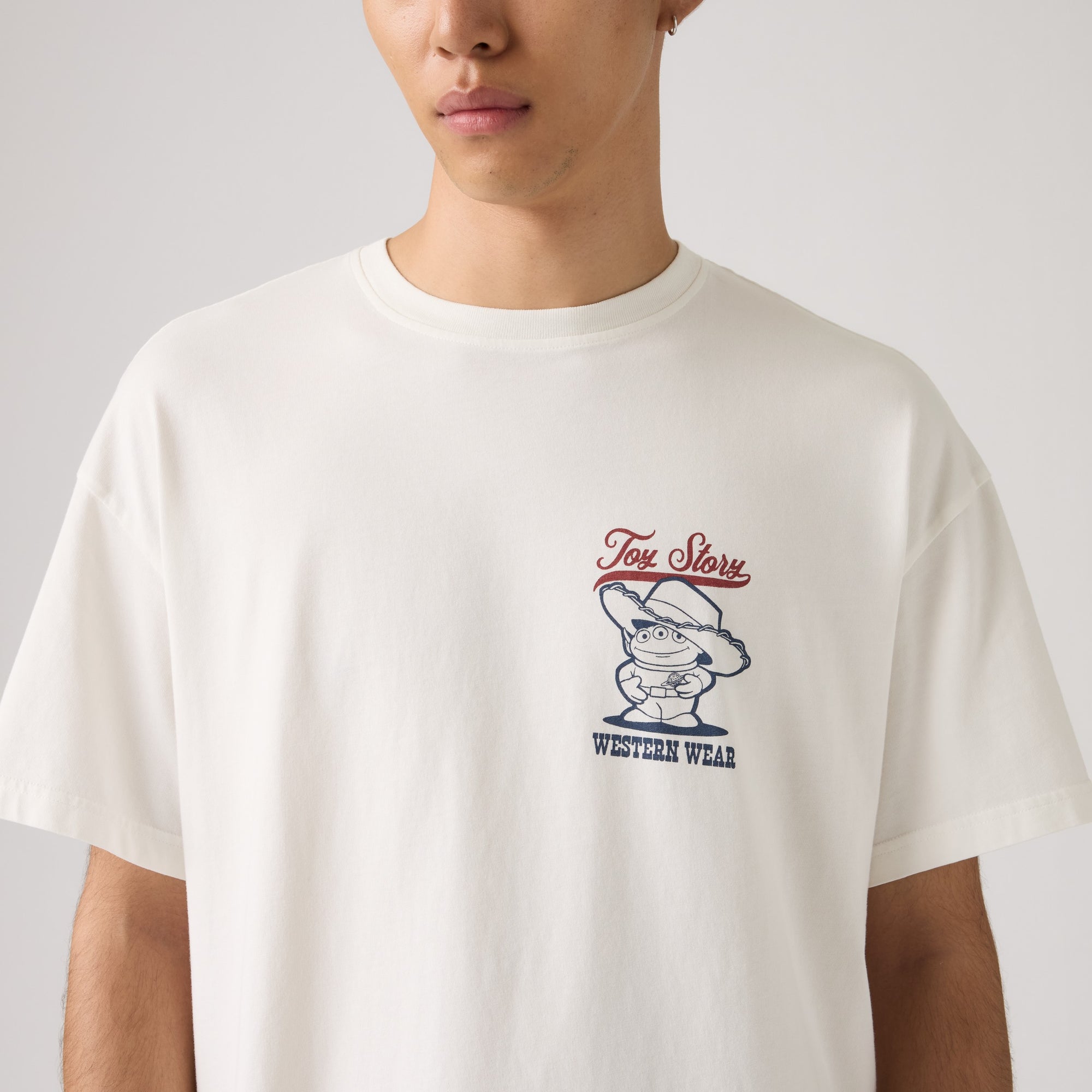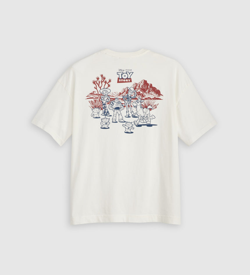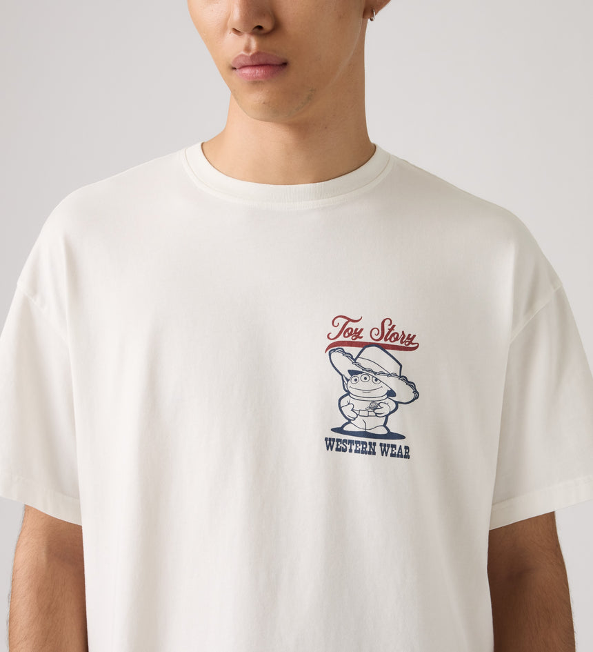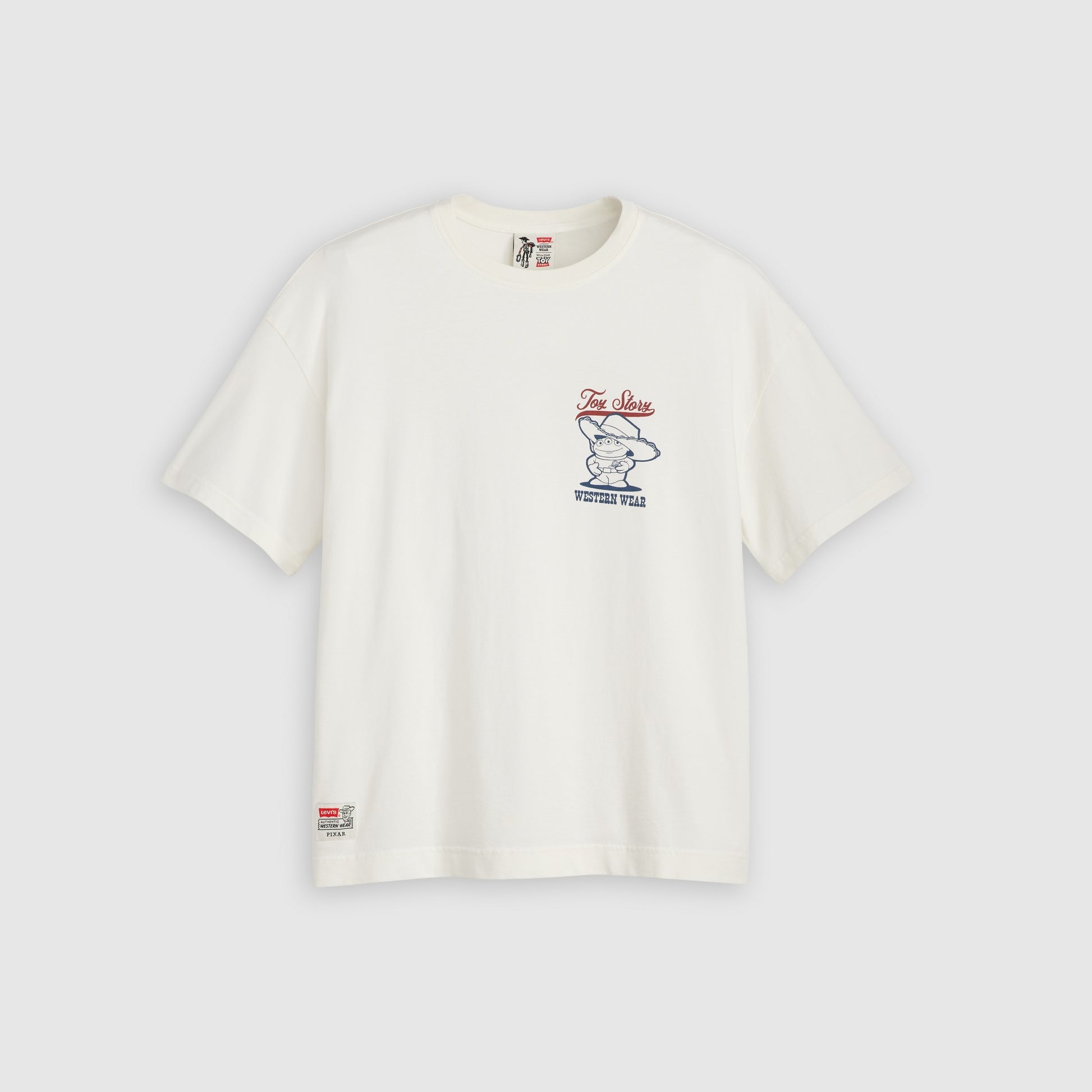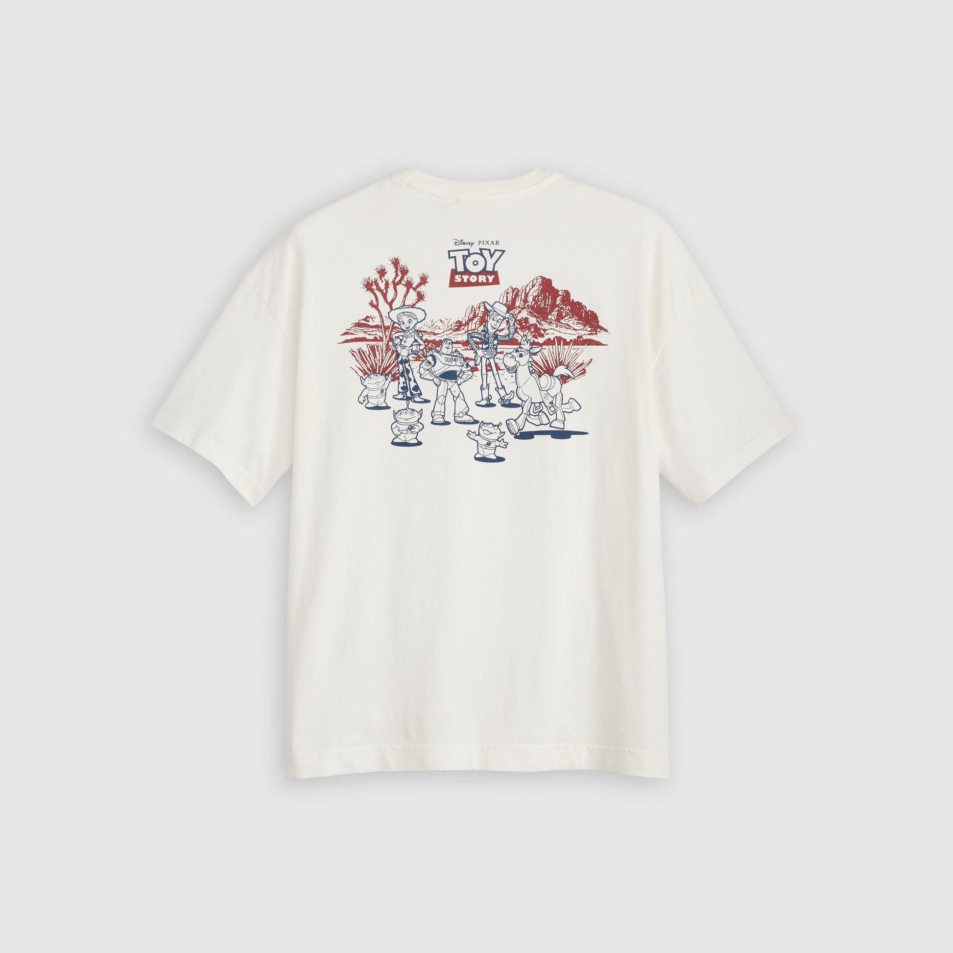 This limited-edition Boxy Tee features a vintage wash with the beloved alien character wearing a cowboy hat and Toy Story script all topped off with all of your favorite characters in a western landscape on the back.