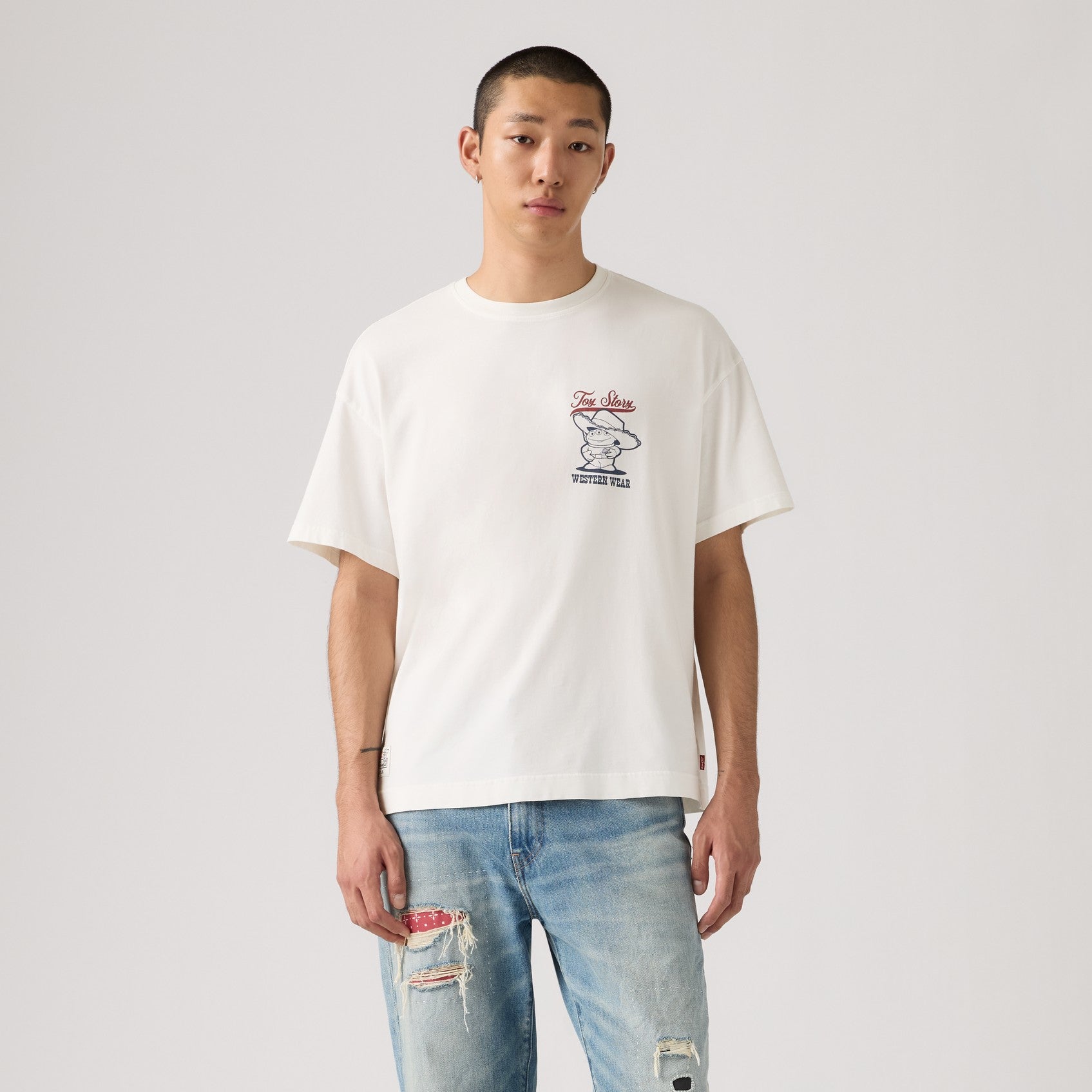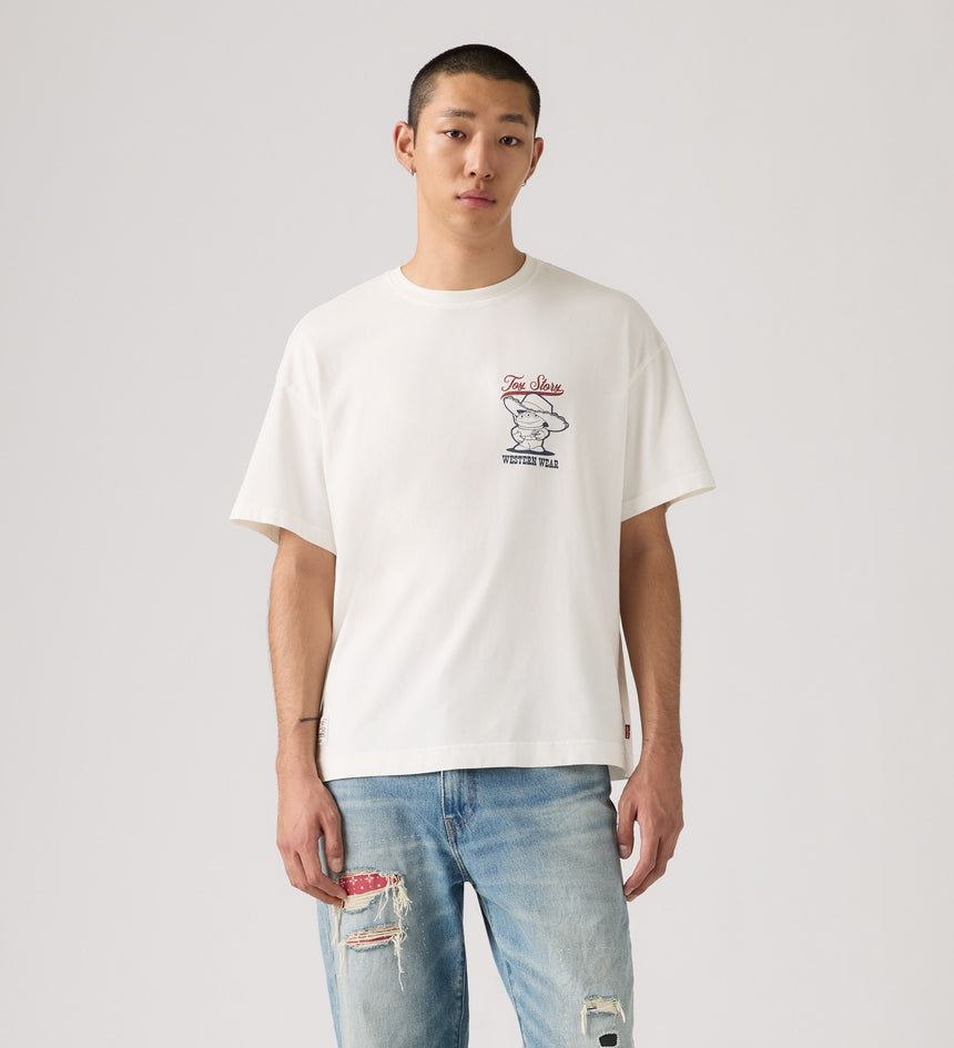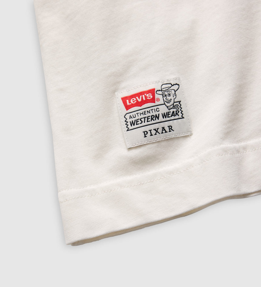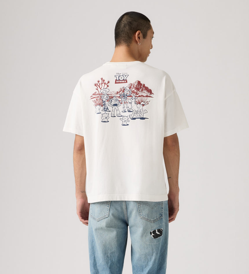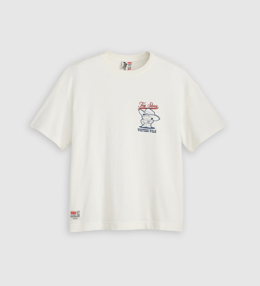 This limited-edition Boxy Tee features a vintage wash with the beloved alien character wearing a cowboy hat and Toy Story script all topped off with all of your favorite characters in a western landscape on the back.
