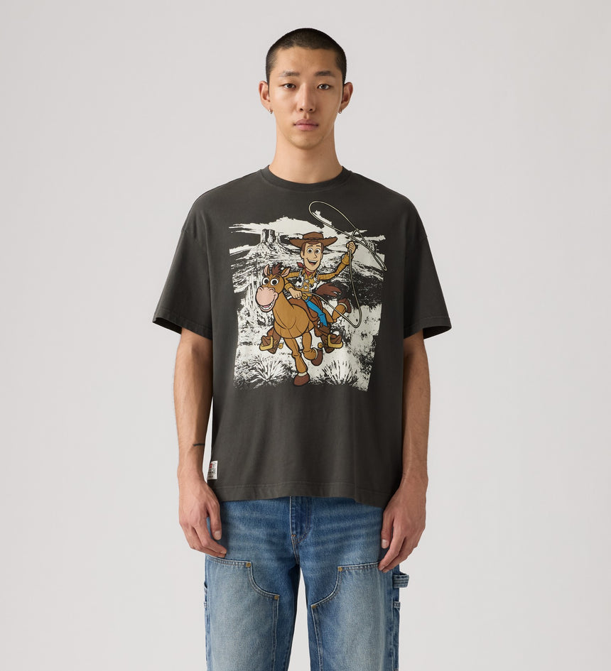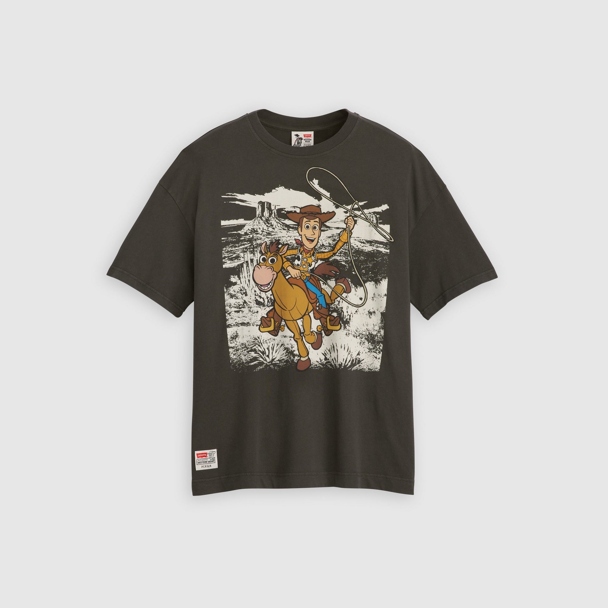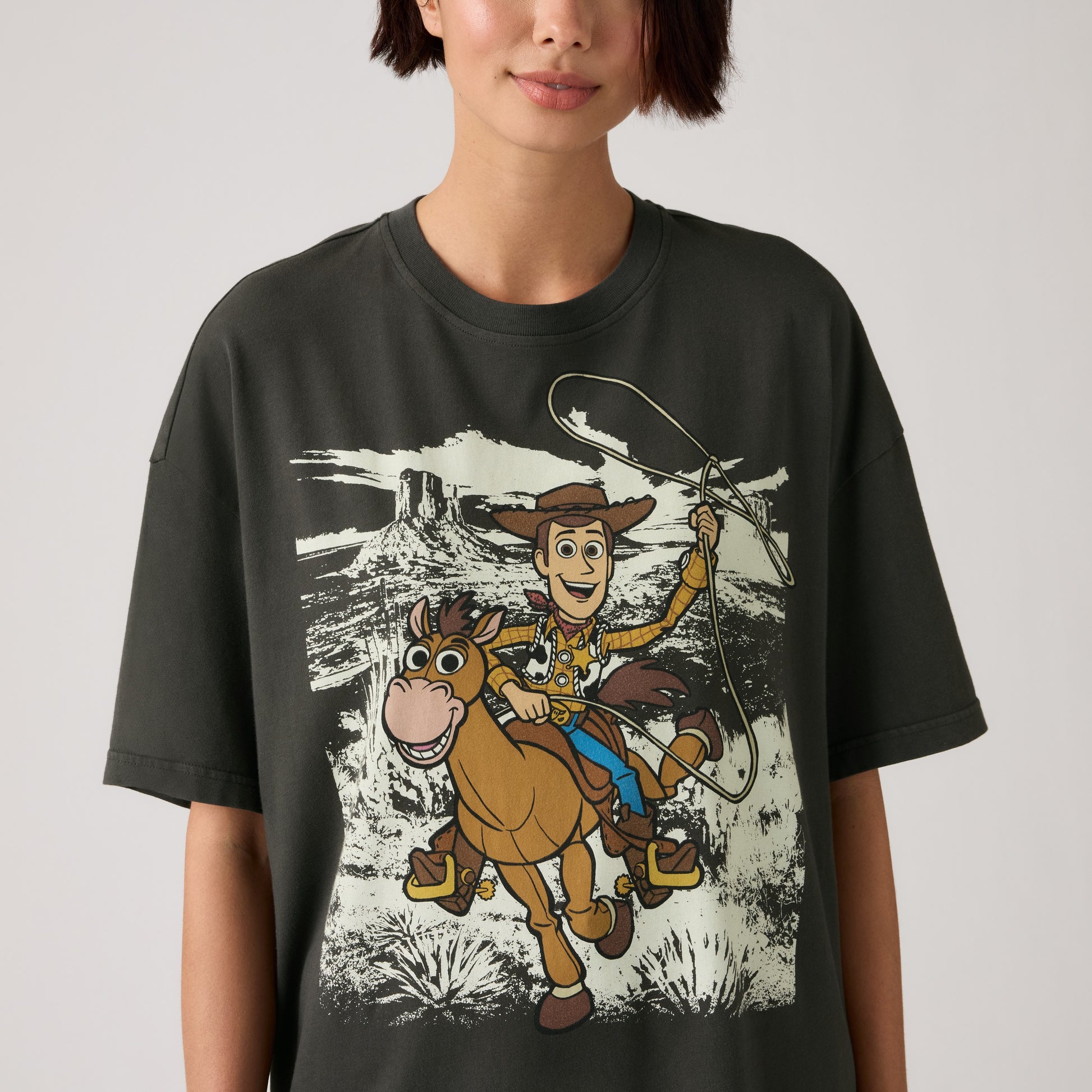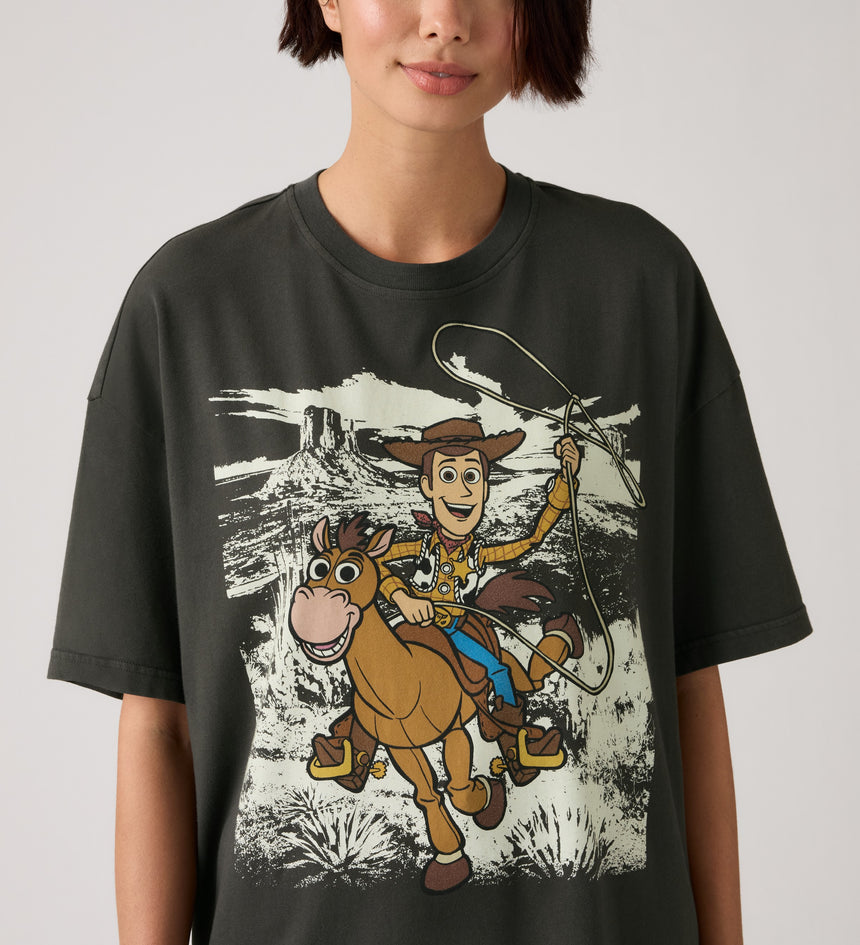 This limited-edition Boxy Tee features a vintage wash with a one-of-a-kind Woody graphic riding Bullseye through a western landscape.