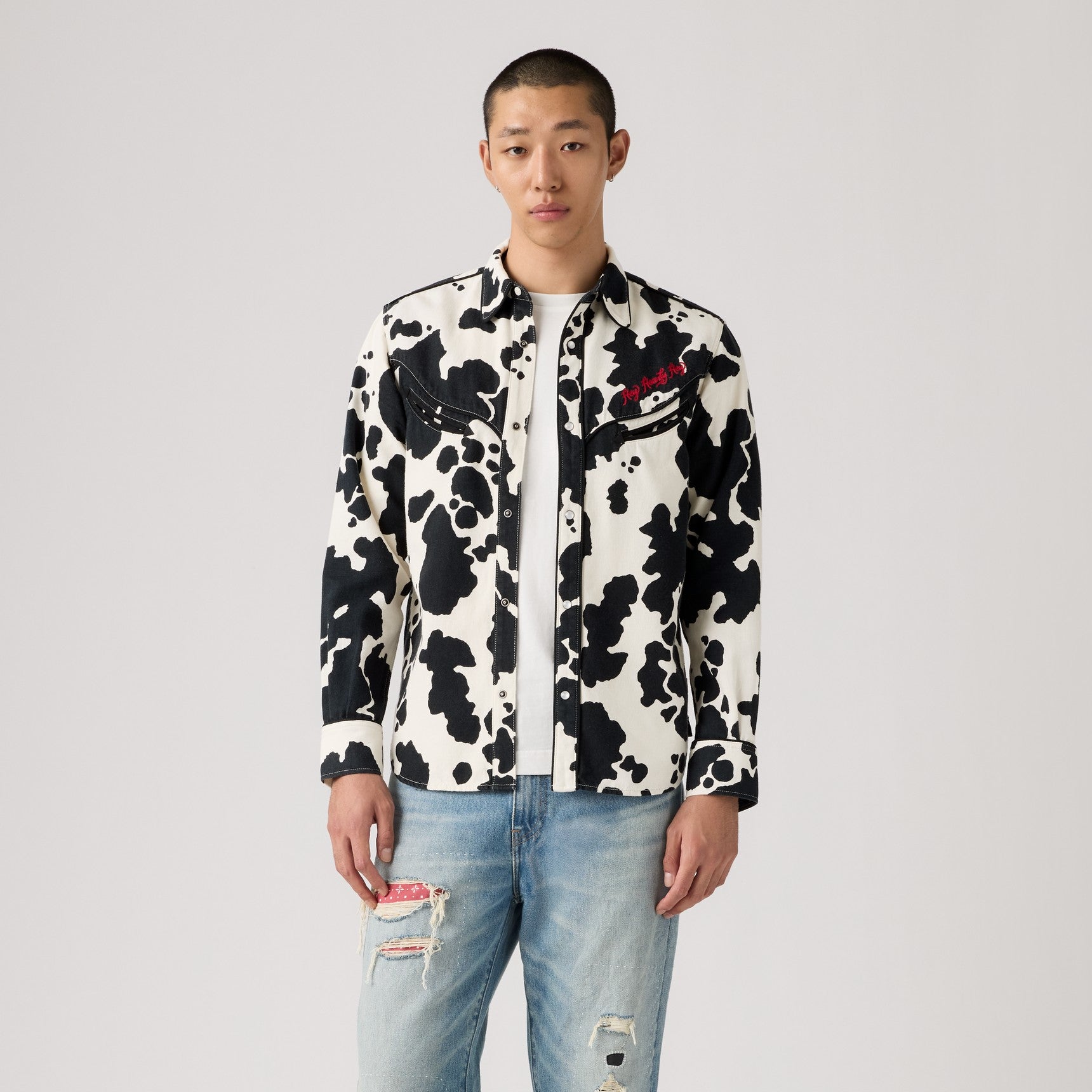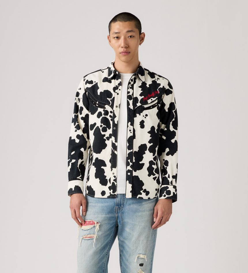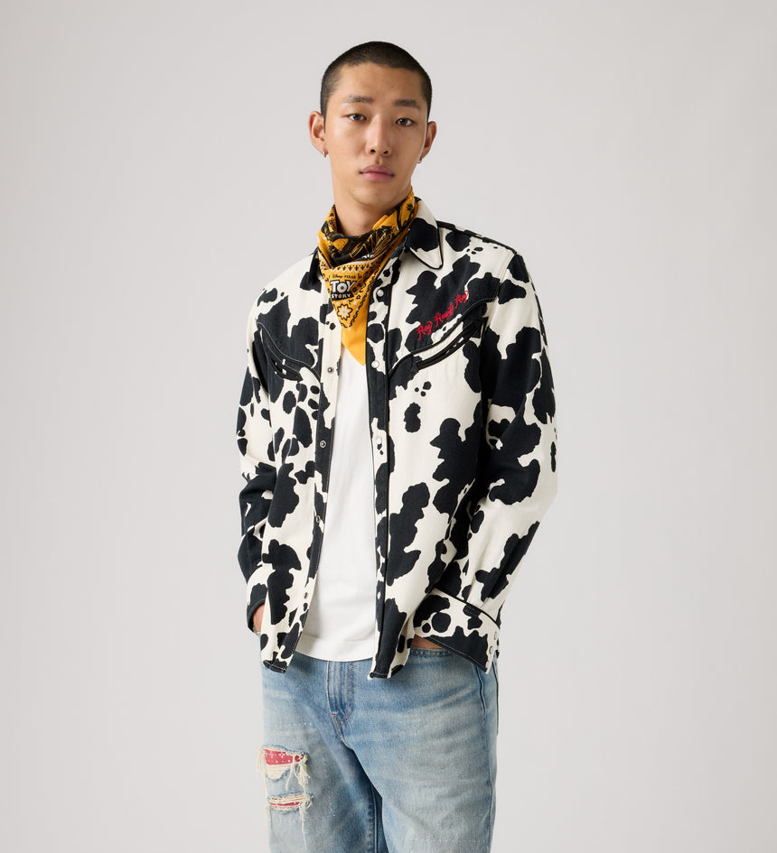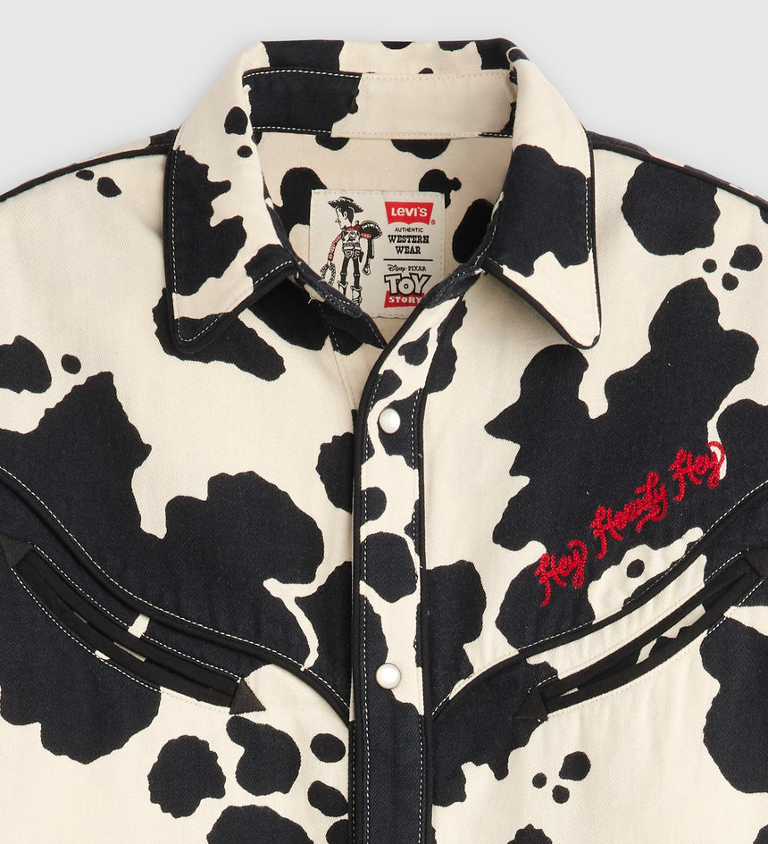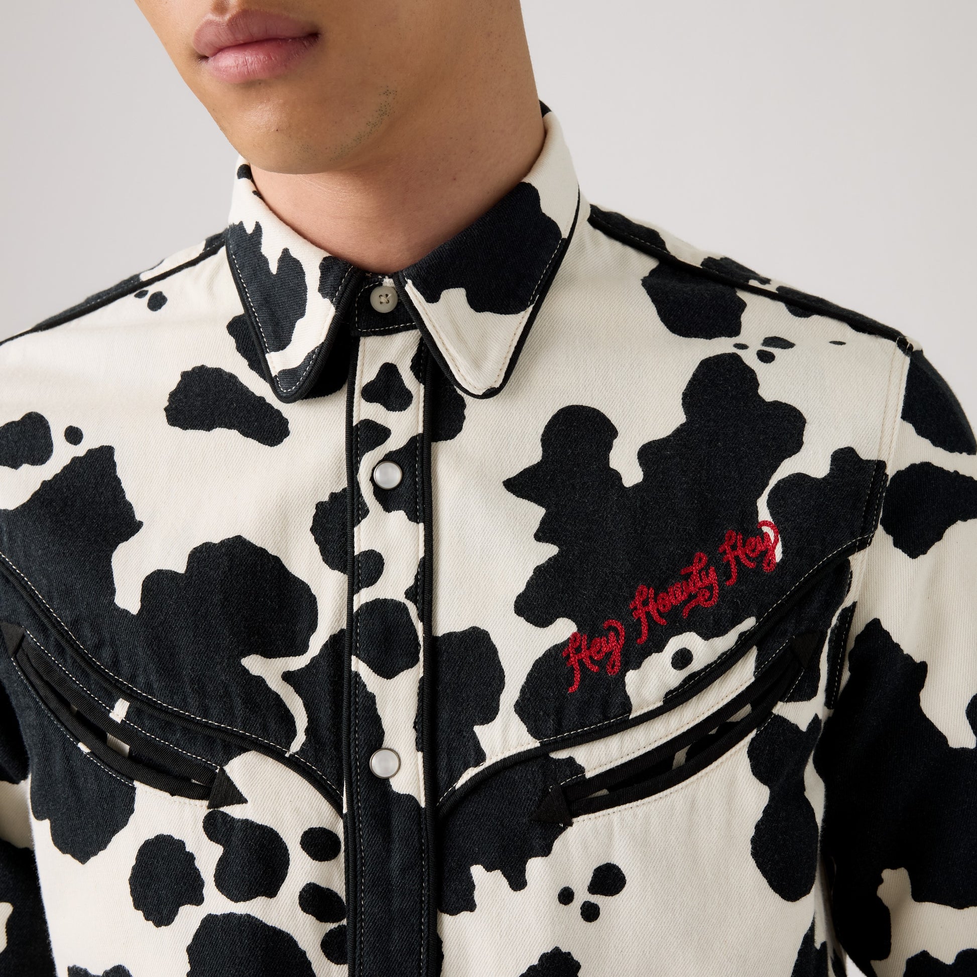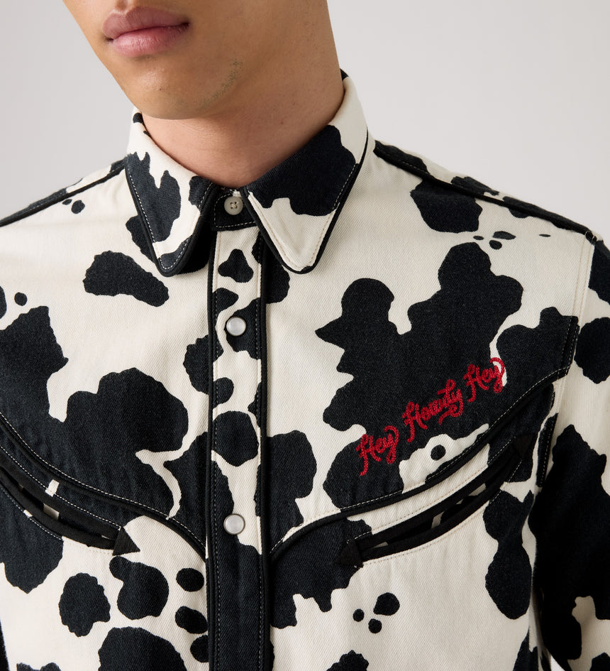 This limited-edition Rodeo Shirt is made with ecru denim and features all-over cow print, a one-of-a-kind "Hey Howdy Hey" embroidery and western-inspired mother-of-pearl snaps.
