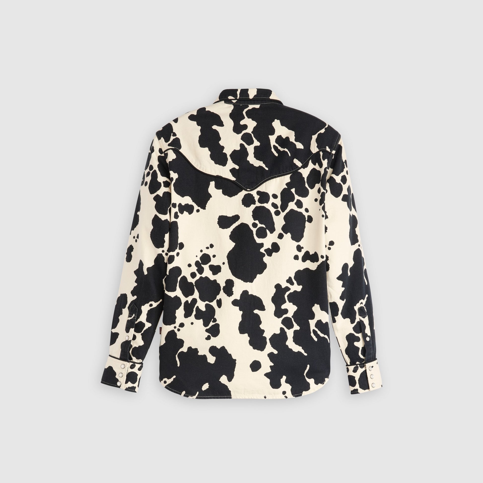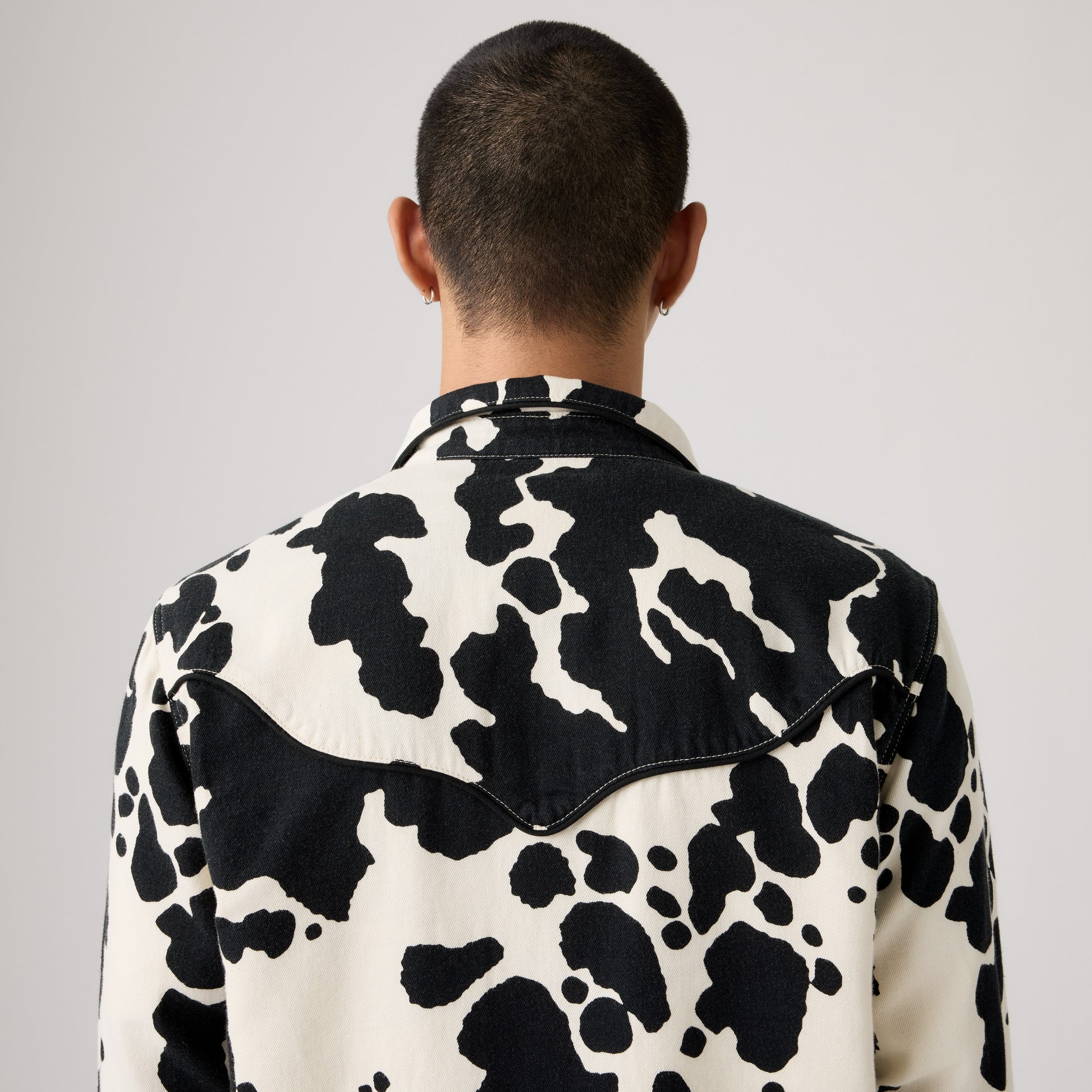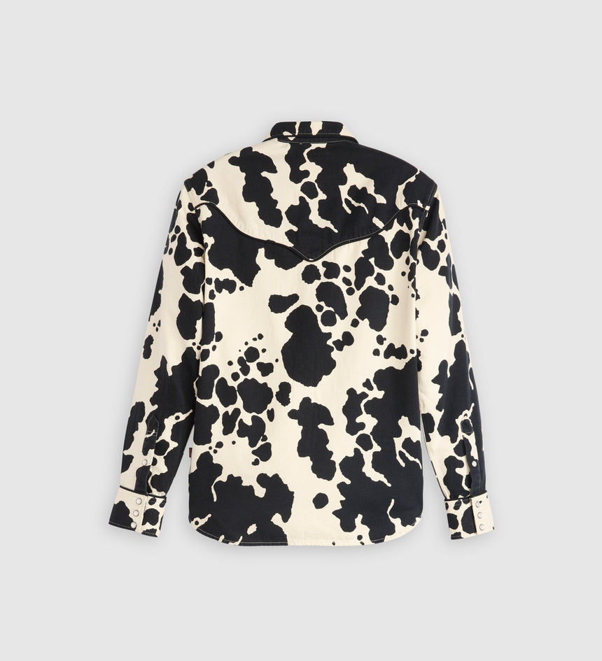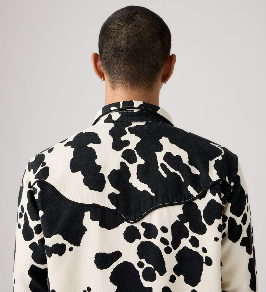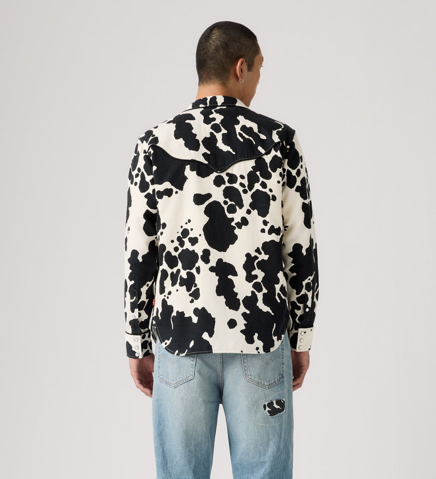 This limited-edition Rodeo Shirt is made with ecru denim and features all-over cow print, a one-of-a-kind "Hey Howdy Hey" embroidery and western-inspired mother-of-pearl snaps.
