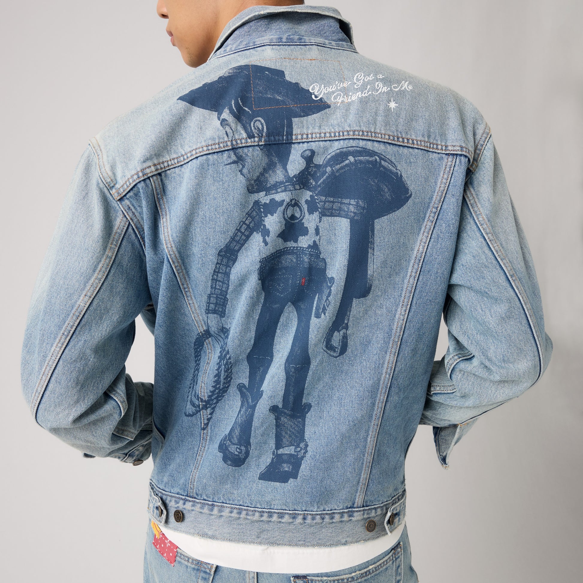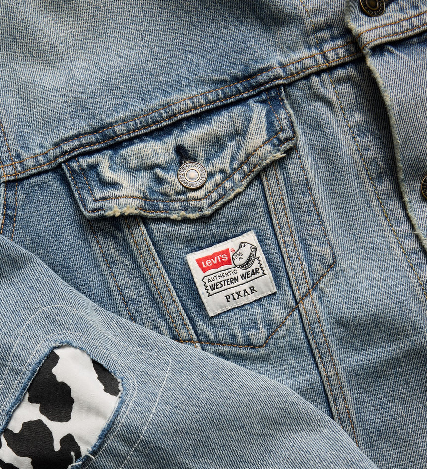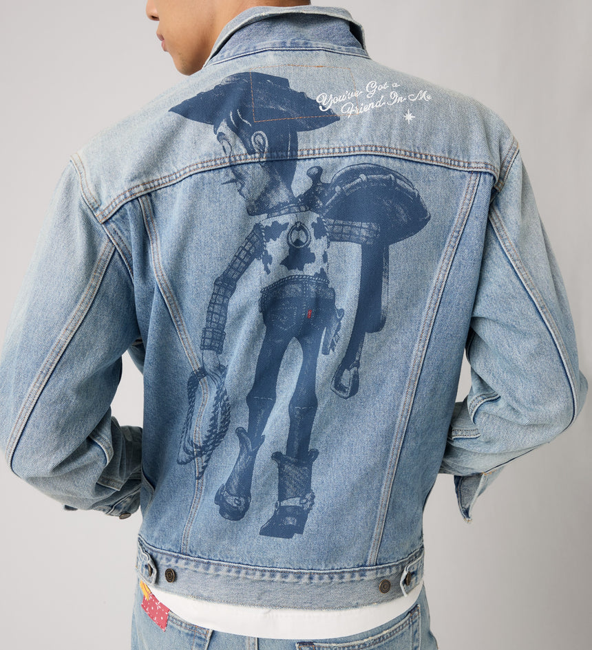 This limited-edition Type III Trucker Jacket features patch and repair detailing that uses Woody's iconic fabric patterns and a Woody Saddleman graphic complete with our iconic red tab on his jeans and the catch phrase "You've got a friend in me" printed on the back yoke.