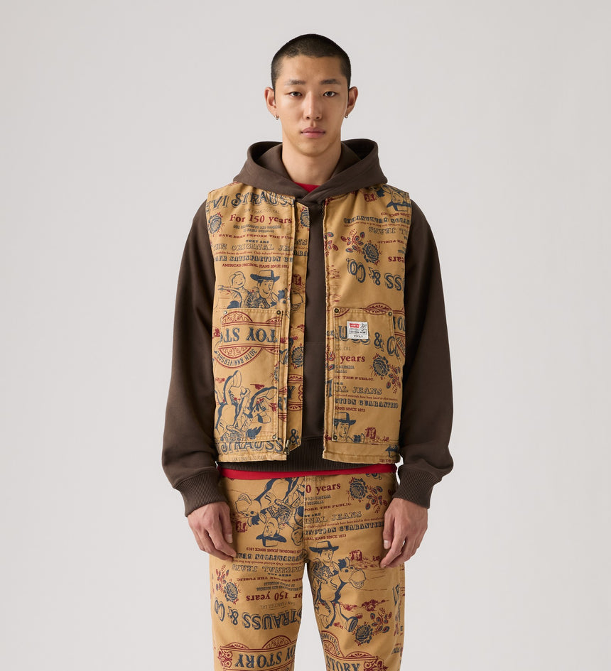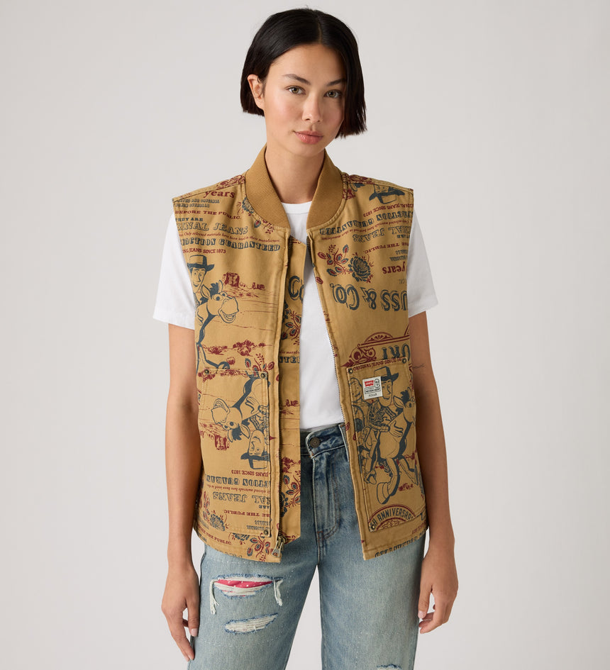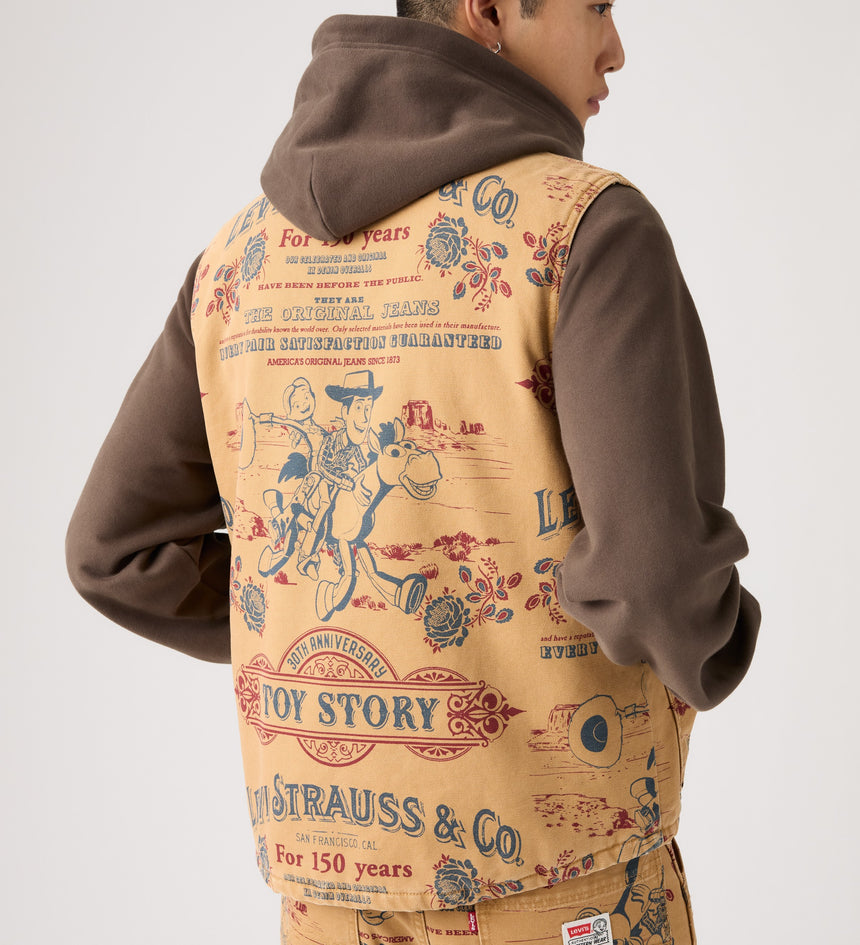 This limited-edition zip-front Vest features a quilted lining, kangaroo pockets, flour sack printed canvas and is finished with the 30th anniversary artwork of Jessie and Woody riding Bullseye on the back.