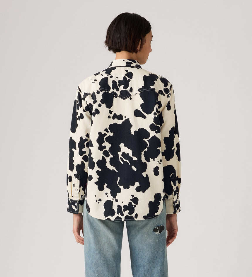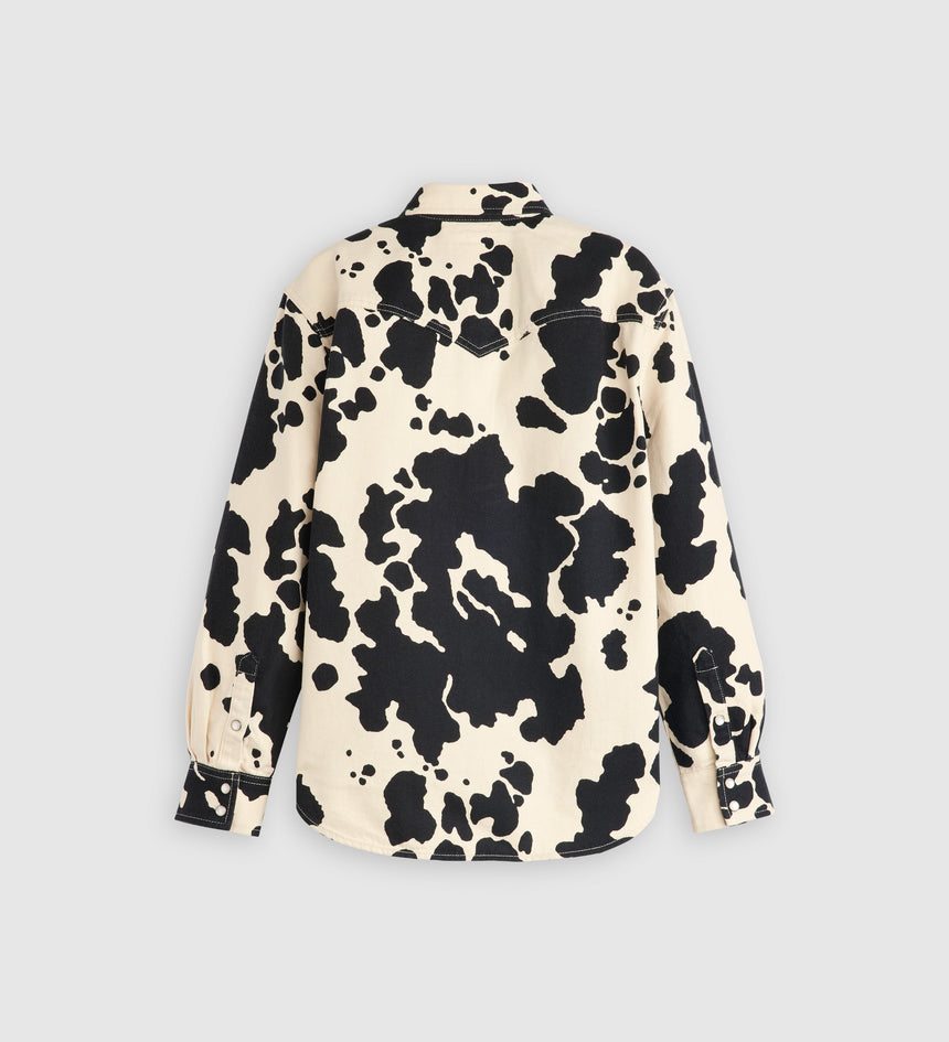 This limited-edition Western Shirt features a cropped, slim fit and an all-over cow print with Jessie branding throughout.