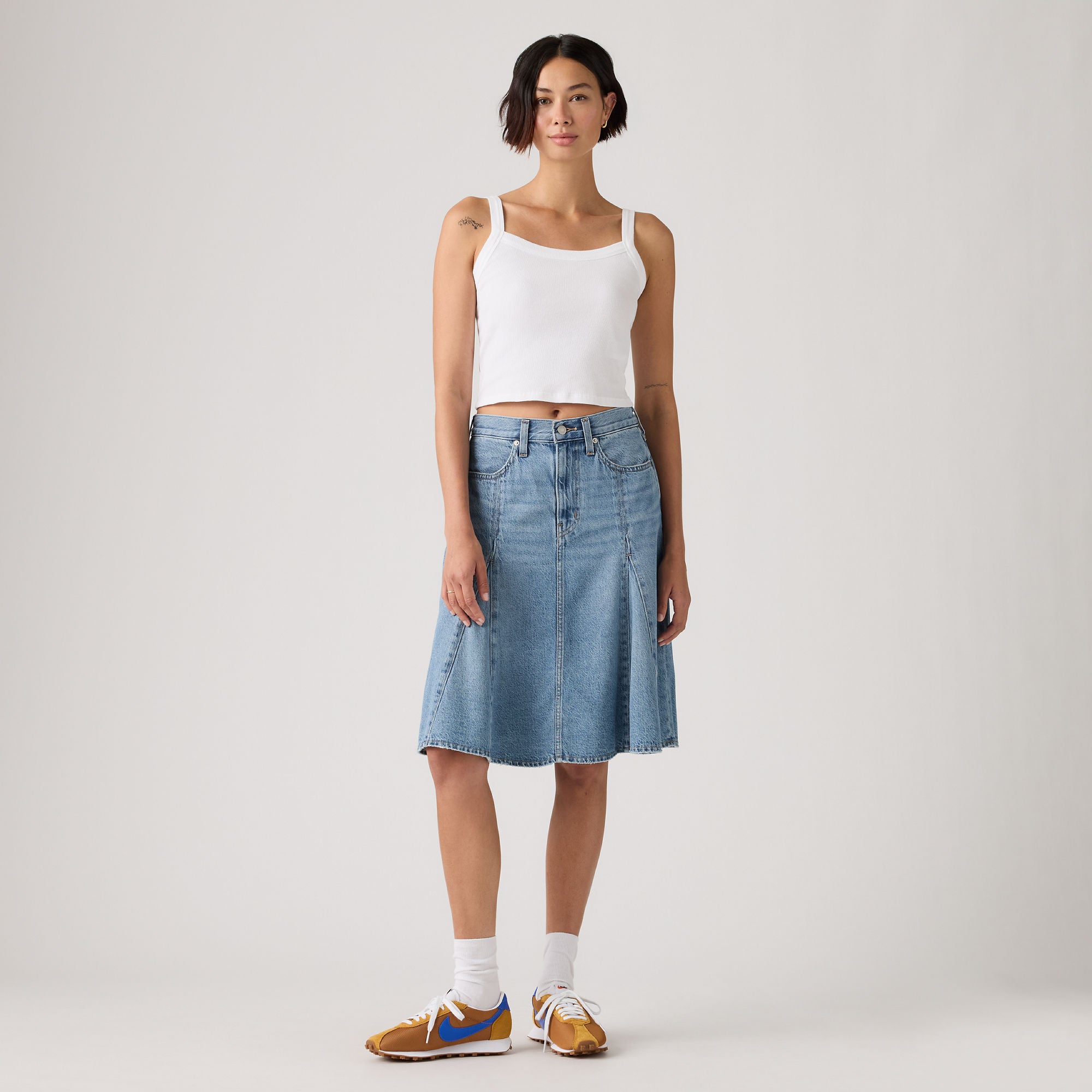 Your favorite denim—now in the perfect knee-length skirt. Our Godet Knee-Length Skirt is designed with a flattering mid rise—all topped off with lightweight denim construction.