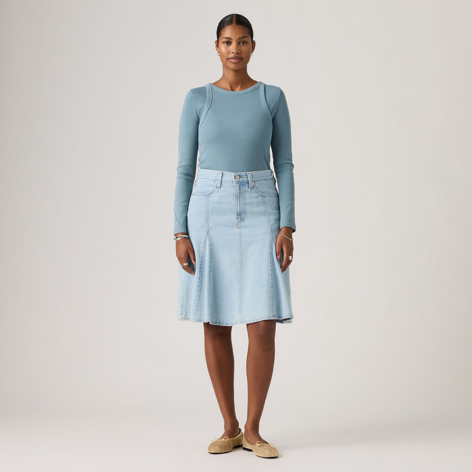 Your favorite denim—now in the perfect knee-length skirt. Our Godet Knee-Length Skirt is designed with a flattering mid rise—all topped off with lightweight denim construction.
