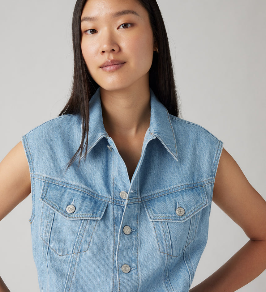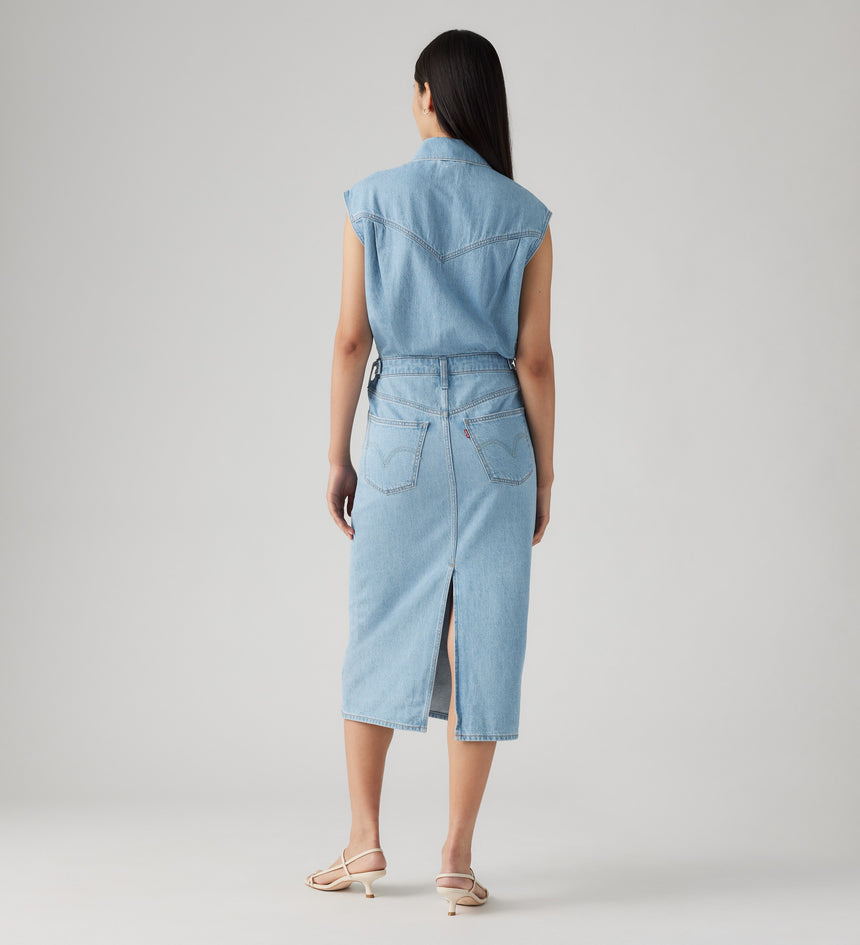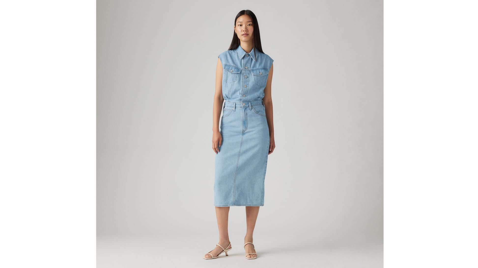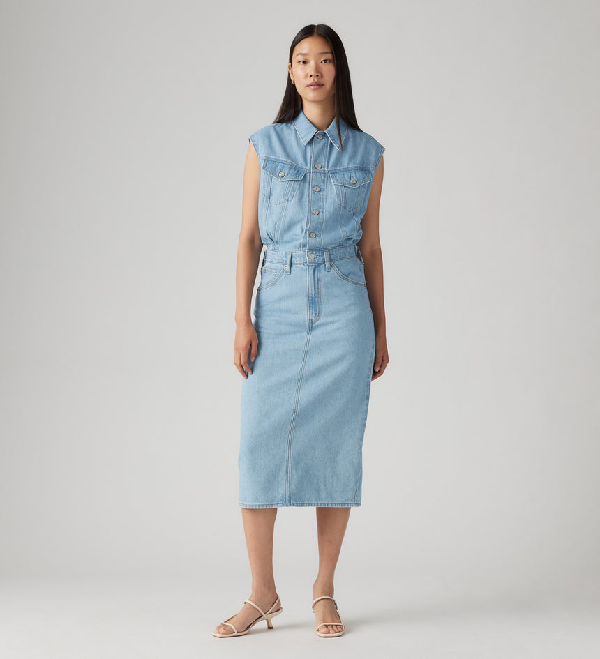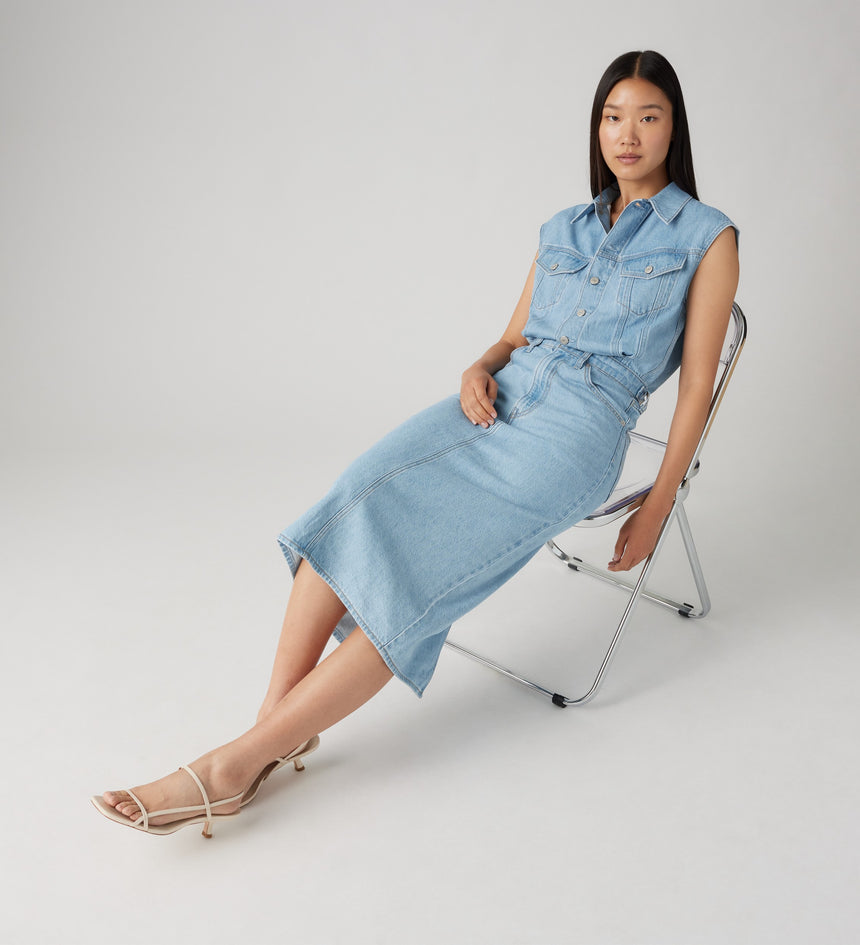 Our Iconic Sleeveless Dress gets its name for a reason. Designed with drapey denim, it pays homage to our timeless Trucker Jacket with two front pockets and a classic button-up design—all topped off with the perfect midi length.