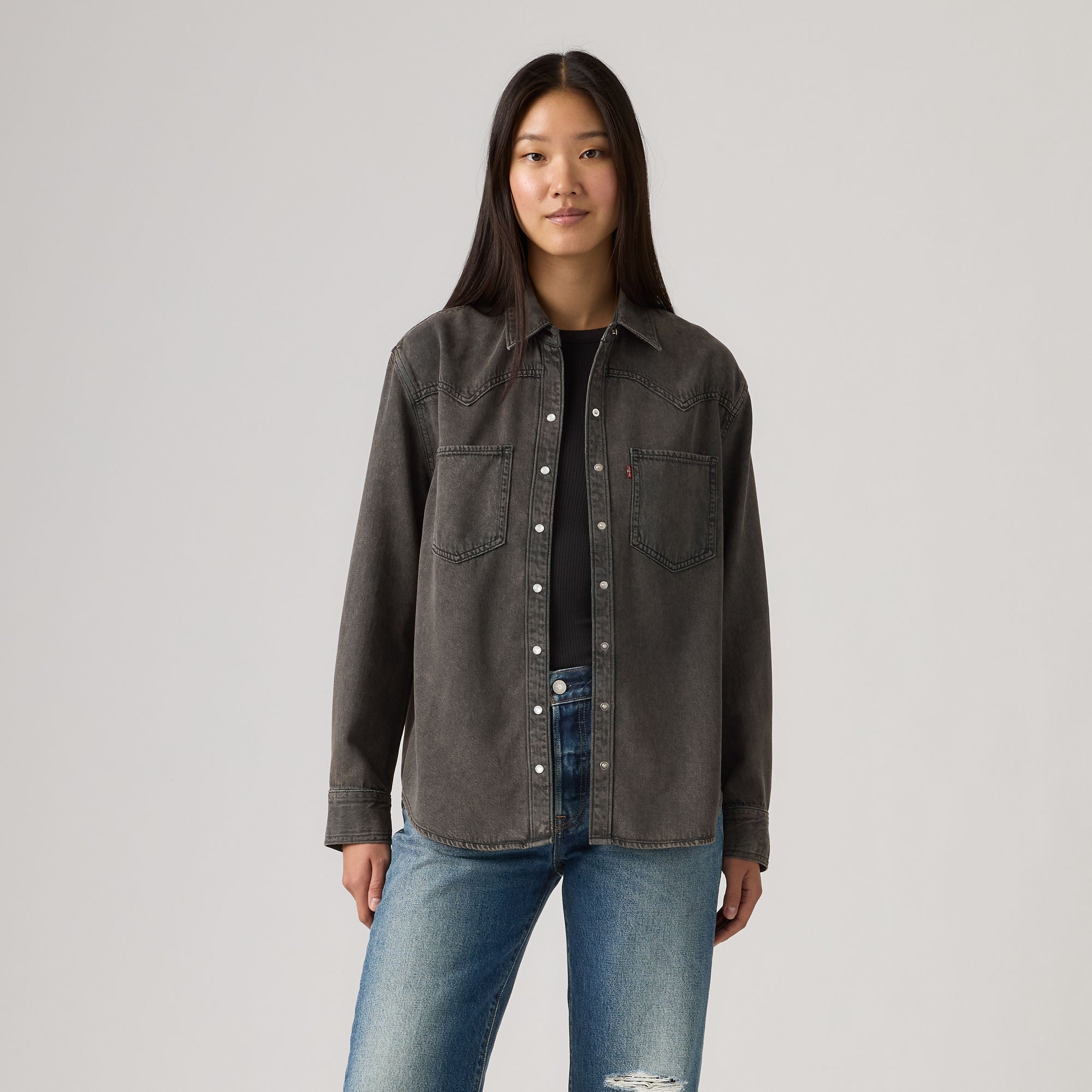 Cowboy boots not included. Our Teodora Western Shirt is a feminine take on a western staple, with a classic snap-button front, two patch pockets, a relaxed fit and a western-inspired yoke design.